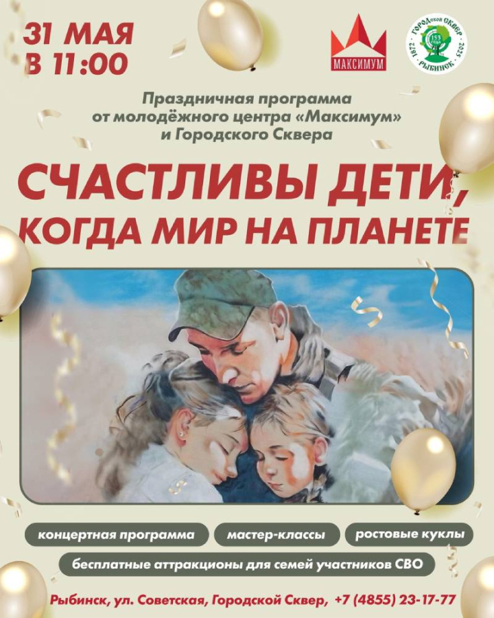 «Счастливы дети, когда мир на планете» — такой праздник организует в Рыбинске МЦ «Максимум» при поддержке Городского сквера. Программа пройдет накануне Дня защиты детей 31 мая в городском сквере.
