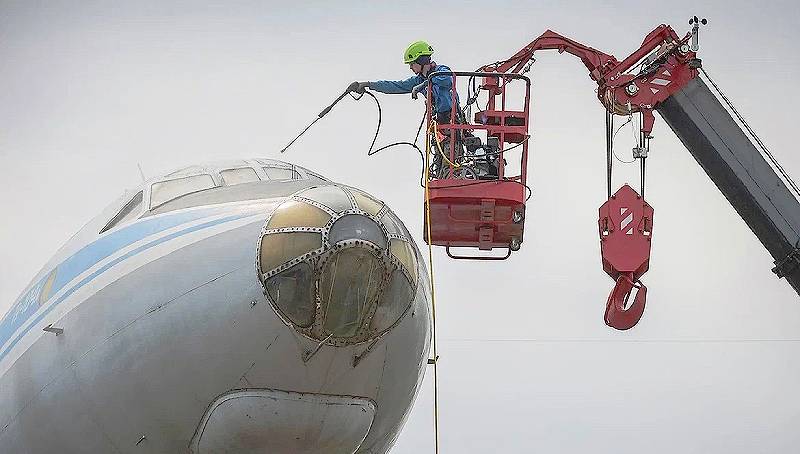 Самолет моют в четыре захода с использованием щадящих моющих средств.