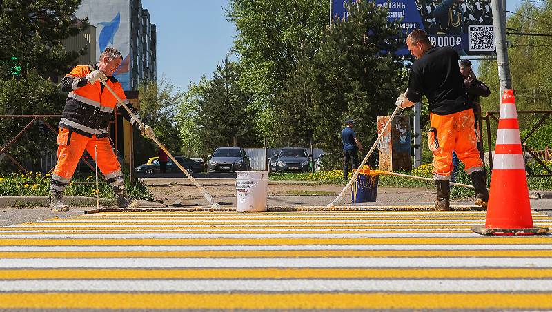 Всего в городе 430 зебр. Разметку уже нанесли на 396 пешеходных переходов: 118 из них выполнили в бело-желтой эмали.