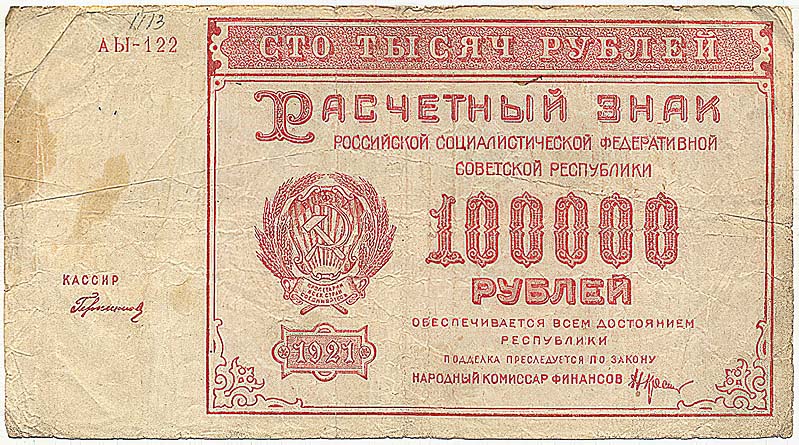Расчетный знак 100 000 рублей, 1921 год