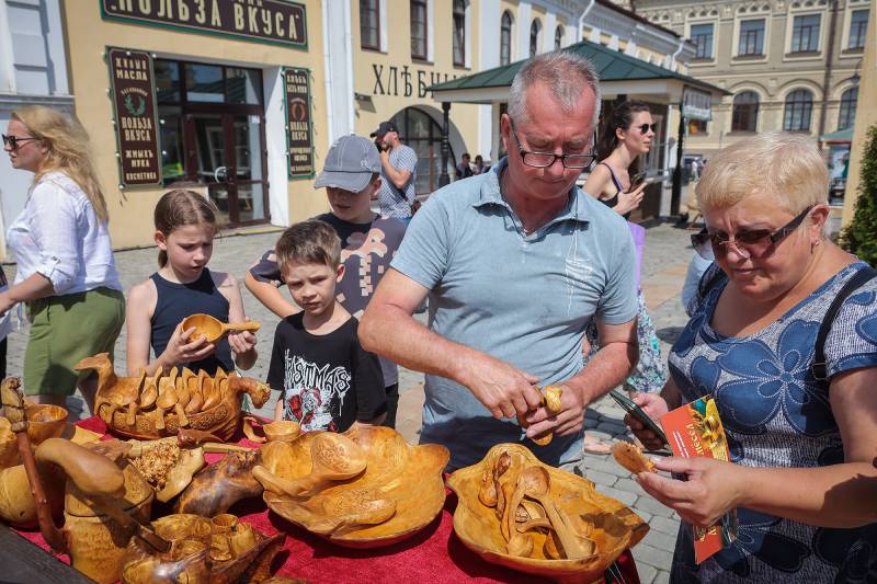 На Красной площади многолюдно. Народ фотографируется с деревянными скульптурами, тестирует на удобство и прочность парковые диваны из термоясеня, вырезает из дерева сувениры, отдыхает от солнца в деревянных же павильонах, возведенных здесь буквально накануне. С 10 июля Рыбинск принимал участников главного события в стране, связанного с деревянным строительством.
