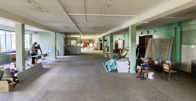В школе №17 акцент сделан на внутренние помещения: холлы, спортзал, кабинеты, санузлы, слесарные мастерские. Во всем здании устанавливают новые двери — и внутренние, и входные.