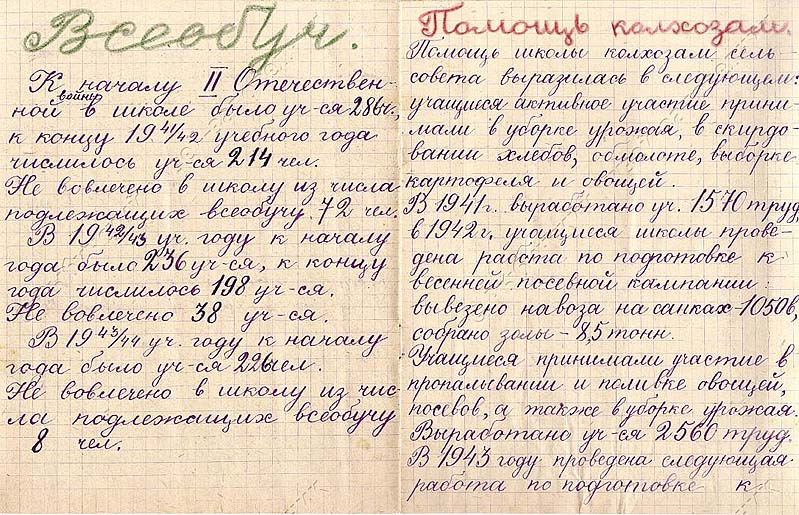 На колхозные работы в то военное лето вышли 12 отрядов школы № 1, около 500 человек. Подростки постарше заготавливали веники для скота, пололи картофель и овощи. А также их ждали «молотьба и веяние, сортировка зерна, копка картофеля». Ученики помладше собирали лекарственные растения.