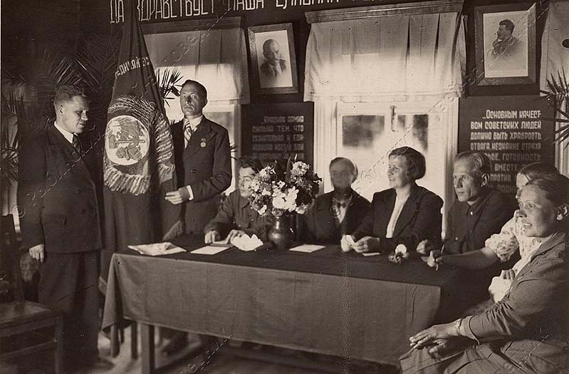 Знамя Комитета обороны вручают колхозу им. Тимирязева, 1944 г.