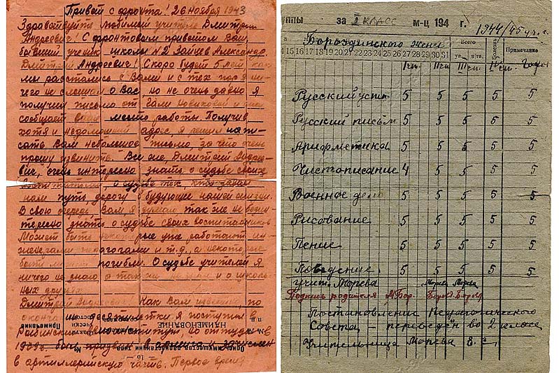 Письмо с фронта от рыбинца Зайцева Александра своему учителю, 1943 г. / Табель успеваемости Евгения Бороздинского, ученика 1 класса, за 1944-45 год
