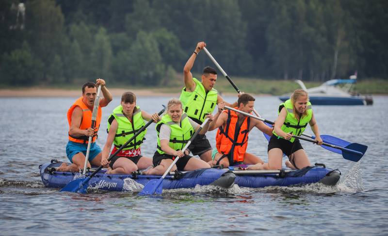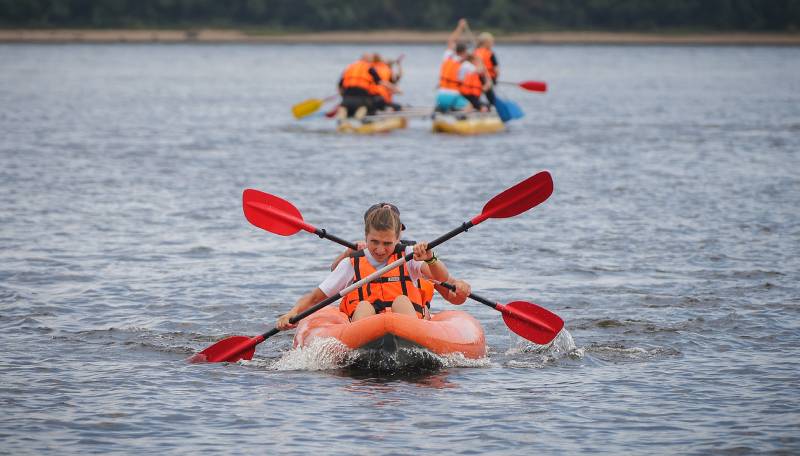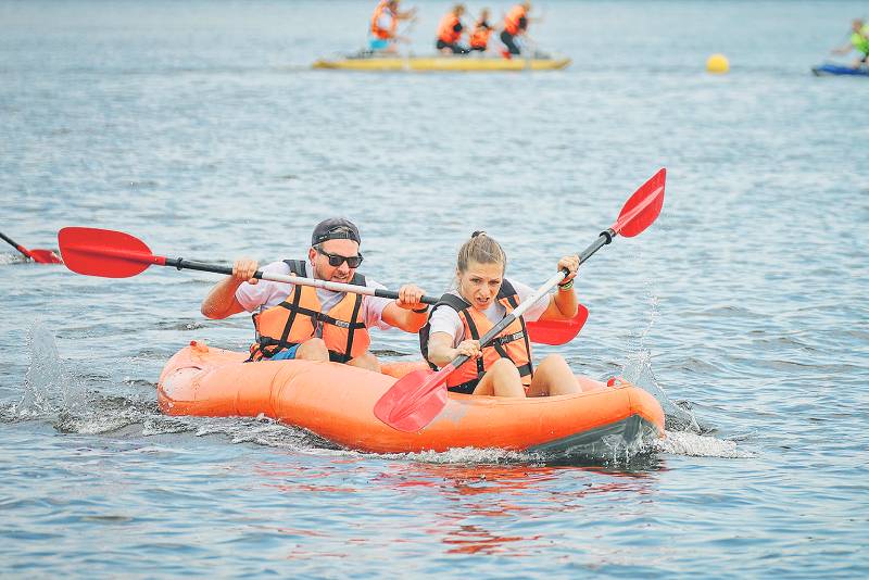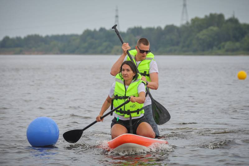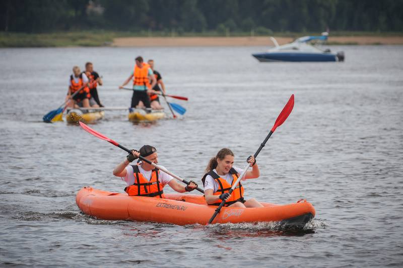 Первое испытание — гонки на туристических и вело-катамаранах. В каждой сборной за победу боролись юноши и девушки. Иногда за весла брались парами, а где-то поработать пришлось одновременно команде из шести человек. Также определяли лучших пловцов на сапбордах, байдарках и надувных «бананах». Средняя длина всех дистанций – 250 метров.
