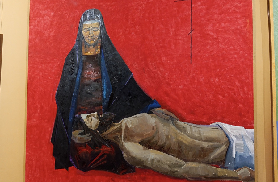 Эмоционально сильное впечатление производят два масштабных панно. В «Благовещении» нежно зеленый фон символизирует предвкушение рождения чего-то нового, чудесного. Об этом говорит и расслабленная фигура женщины в центре. В сцене Pieta тон становится алым, а от фигур главных героев — девы Марии и Христа — веет горем и какой-то торжественностью.