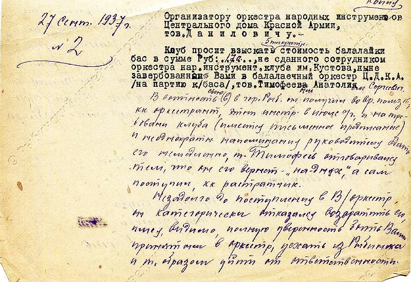 «Клуб Кустова просит взыскать 5-кратную стоимость балалайки-баса с т. Тимофеева Анатолия, ныне завербованного вами в балалаечный оркестр ЦДКА. Он не раз обещал, что вернет инструмент на днях, а сам поступил как растратчик».