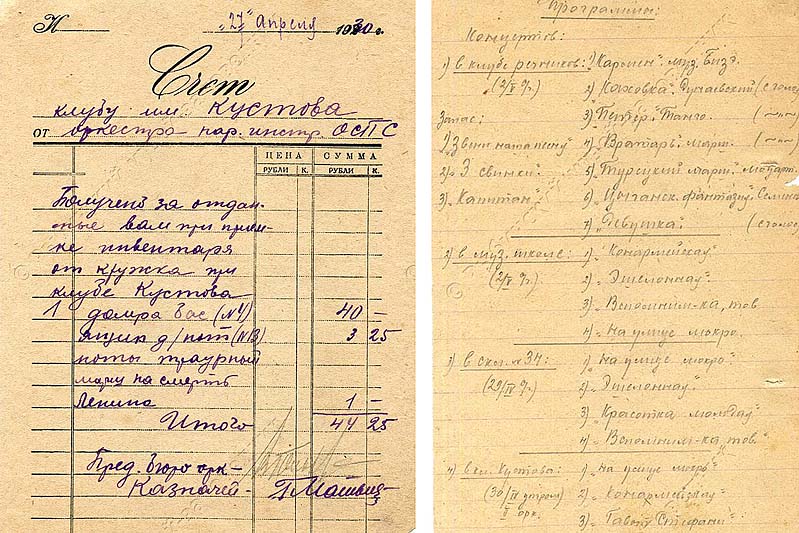 Счет клубу Кустова от оркестра Павлова, 1930/ Программы выступлений кружка народных инструментов, 1937 г.