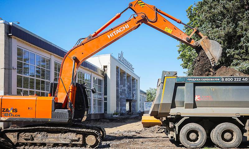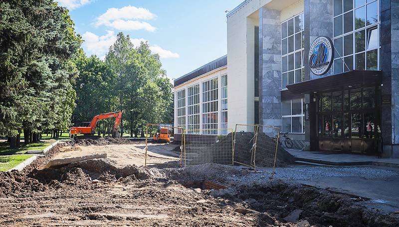 Ранее перед центральным фасадом СК «Метеор» заменили теплосети. Ремонт асфальта завершат к октябрю.