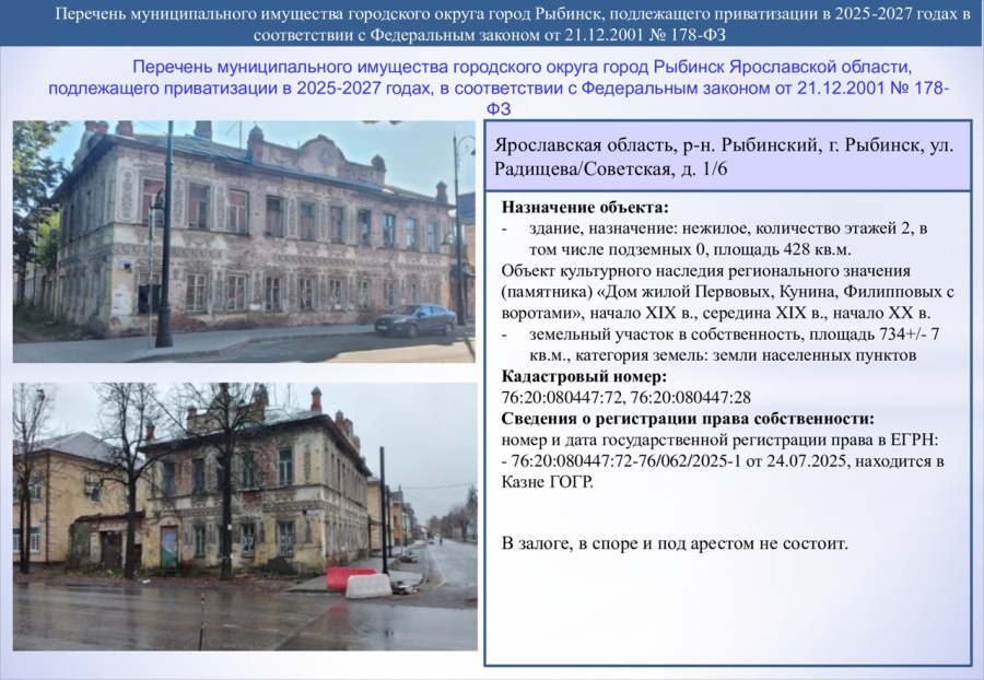 28 августа Муниципальный совет Рыбинска принял решение о включении в план приватизации объекта культурного наследия регионального значения «Дома жилого Первовых, Кунина, Филипповых с воротами», начало XIX в. — начало XX в. Вместе с двухэтажным особняком на углу улиц Советской и Радищева в собственность будущему владельцу также перейдет и земельный участок площадью 734 кв.метров.