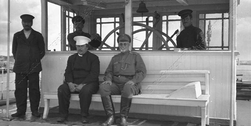Петр Беляков и Александр Азанчеев, владелец имения Переборы (в форме) на пароходе. 1910-е
