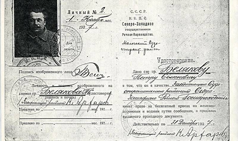 Удостоверение заведующего судостроительным районом Северо-Западного речного пароходства Петра Белякова, 31.12.1927 г.