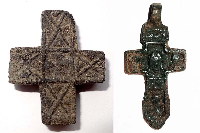 а также бронзовые нательные крестики. На лицевой стороне крестов в средокрестии изображен «Спас Нерукотворный», на боковых ветвях и в нижнем клейме – святые.