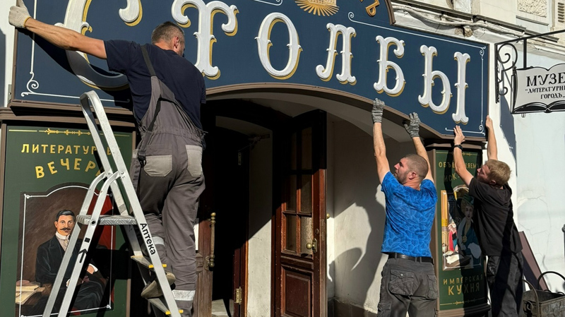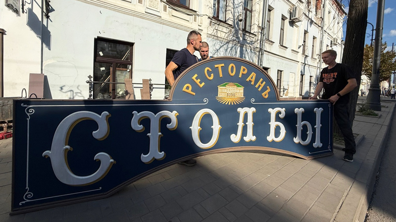 16 сентября на центральной улице Рыбинска смонтировали новую вывеску в дореволюционном стиле. Обновилась входная группа бывшей гостиницы «Столбы». Объединять искусства уже этой осенью здесь будут в одноименном культурно-ресторанном комплексе. В здании располагается и литературный музей.