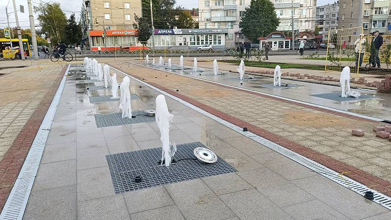 В Рыбинске на обновляемой площади Жукова запустили новый плоскостной фонтан — пока что в рамках испытаний.
