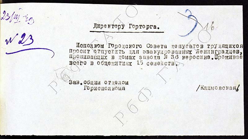 Просьба выделить керосин эвакуированным ленинградцам