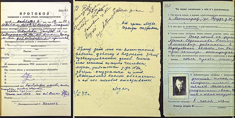 Протокол обыска несовершеннолетней Гали Ивановой / Заявление на усыновление девочки из эвакуированных детей / Карточка воспитанника детдома Евдокимова
