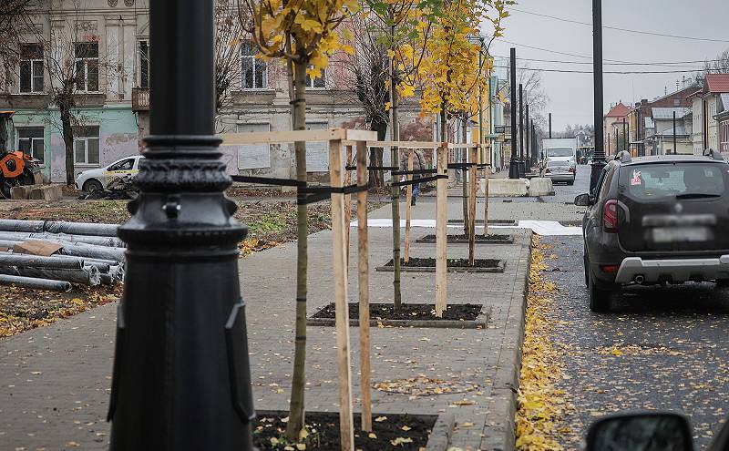 Несмотря на ненастную погоду, продолжаются работы на ул. Чкалова. 28 октября здесь приступили к высадке крупномерных деревьев.