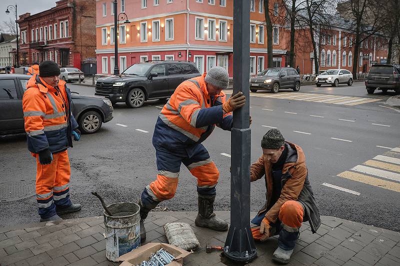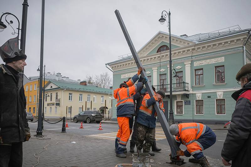 В Рыбинске завершают второй этап реконструкции улицы Чкалова. 19 декабря начали устанавливать чугунные опоры под дорожные знаки и светофоры.