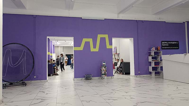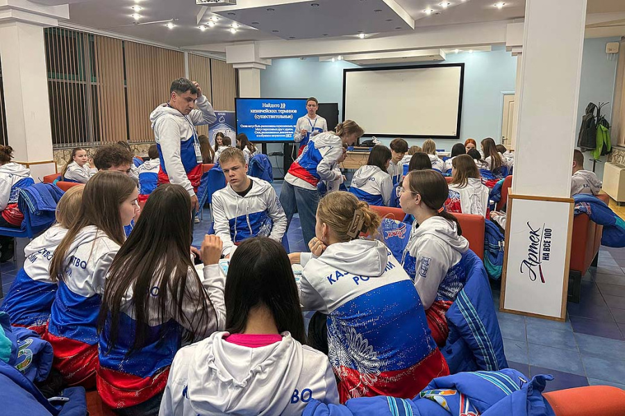 Михаил и еще порядка двадцати мальчишек и девчонок в одинаковых толстовках с триколором собрались небольшими группами вокруг столов, обсуждая очередное задание на экране телевизора – им предстоит назвать десять казначейских терминов-существительных. Ребята озадачены, кураторы дают подсказки и подбадривают своих подопечных.