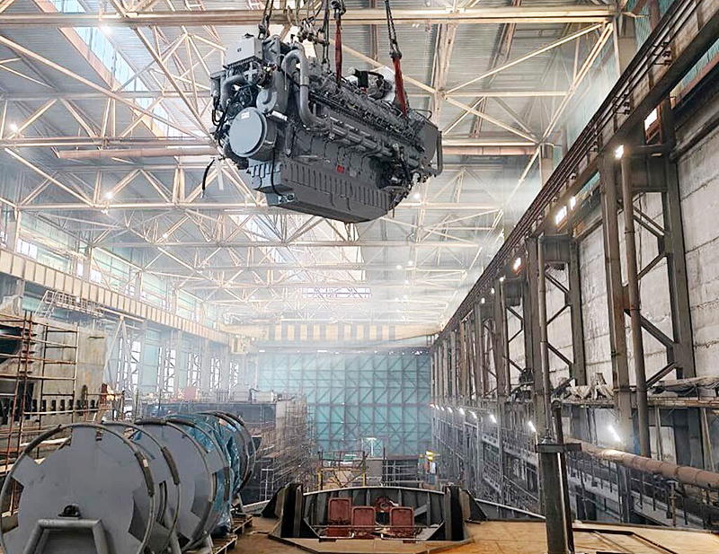На сегодня корпус судна полностью сформирован. Ведется погрузка и монтаж оборудования, в том числе главных двигателей мощностью 2х1800 кВт. Два главных двигателя разместили на подготовленном фундаменте в машинном отсеке.