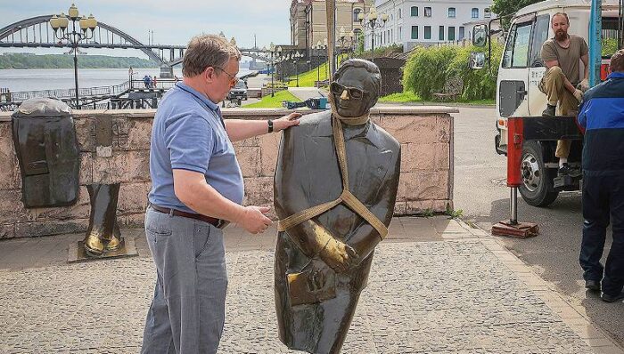 С использованием гипса делали и знаменитого водопроводчика. Мастера учли опыт, полученный при отливке Ошанина, и «спрятали» соединительные швы под руки и воротник скульптуры.