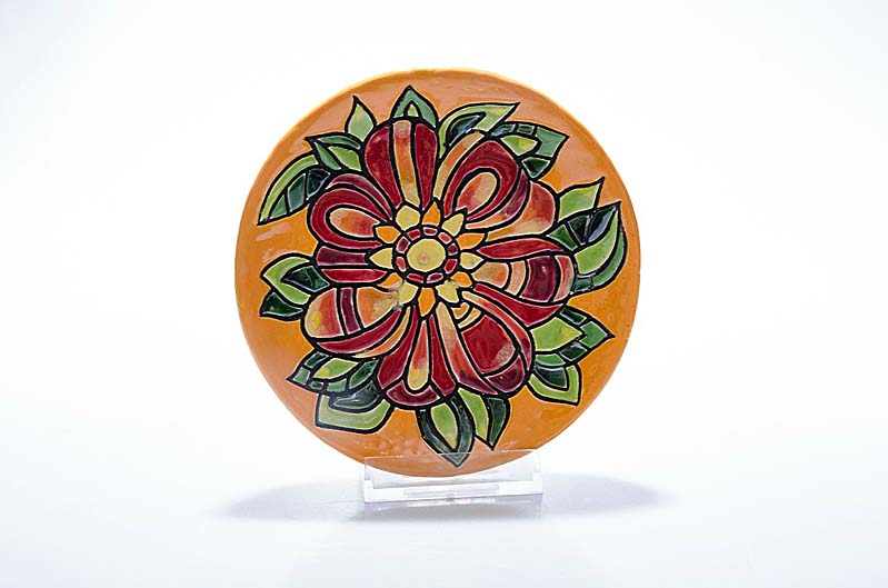 Отдельная тема – роспись керамики. Здесь полет фантазии мастера неограничен. Например, роспись пигментом, где в составе материала используется мелкий порошок, хороша тем, что позволяет создавать графичные рисунки с тонкими линиями. На одной из работ Елены – глазурованной глиняной тарелочке – написан пасторальный пейзаж: маленький мальчик спит на цветочной полянке. Создается впечатление, что тонкие стебельки, бутоны, ангельское личико ребенка написаны тонким карандашом.