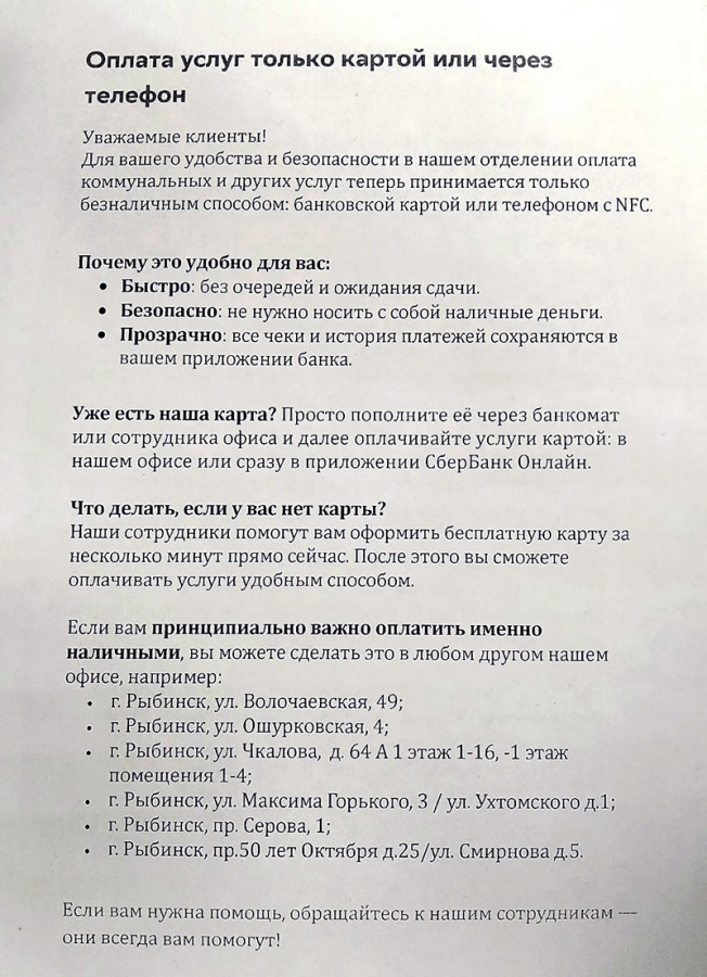 Остальные офисы Сбера в Рыбинске и области принимают платежи по-прежнему — в наличном и безналичном виде.